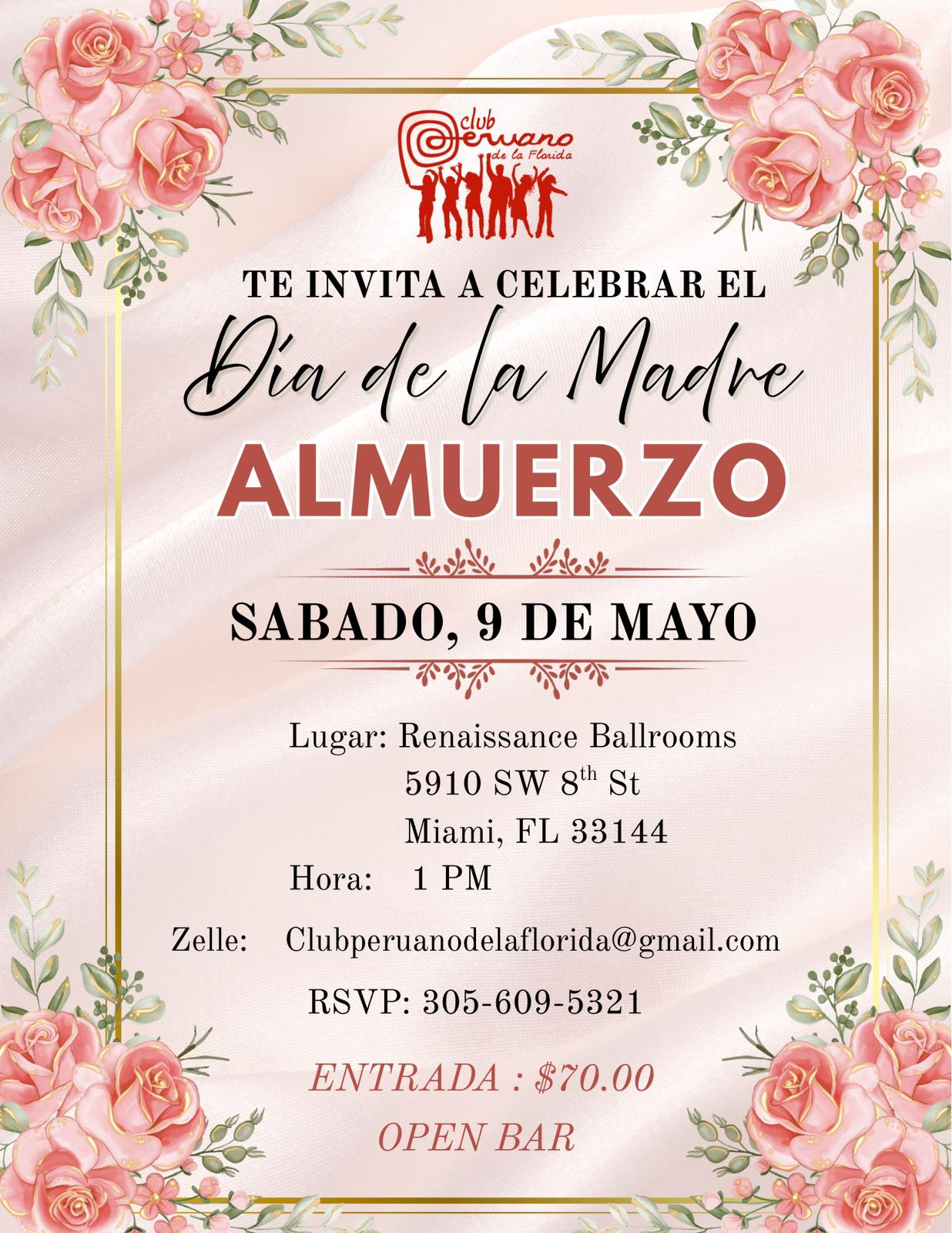 El Club Peruano de la Florida invita a toda la comunidad a celebrar a nuestras queridas mamás con un almuerzo especial .